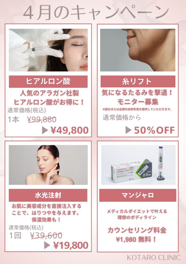 | スレッドリフト(モニター) | 1本44,000円 10本308,000円 | 通常価格の半額 1本15,400円〜 | 糸による本格リフトアップ。この機会にぜひ。 |